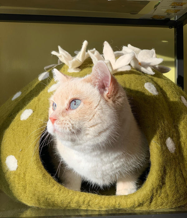 Fabricada artesanalmente en lana natural fieltrada, es ideal para climas frescos y para gatos que aman dormir protegidos y en silencio.