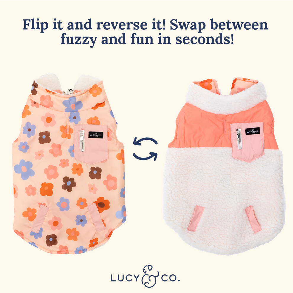 ¡Color, flores y mucha energía! El Let’s Groove Reversible Teddy Vest es ideal para peludos con espíritu alegre. Su estampado floral vibrante y su reverso en color sólido permiten crear dos looks diferentes en un solo chaleco.