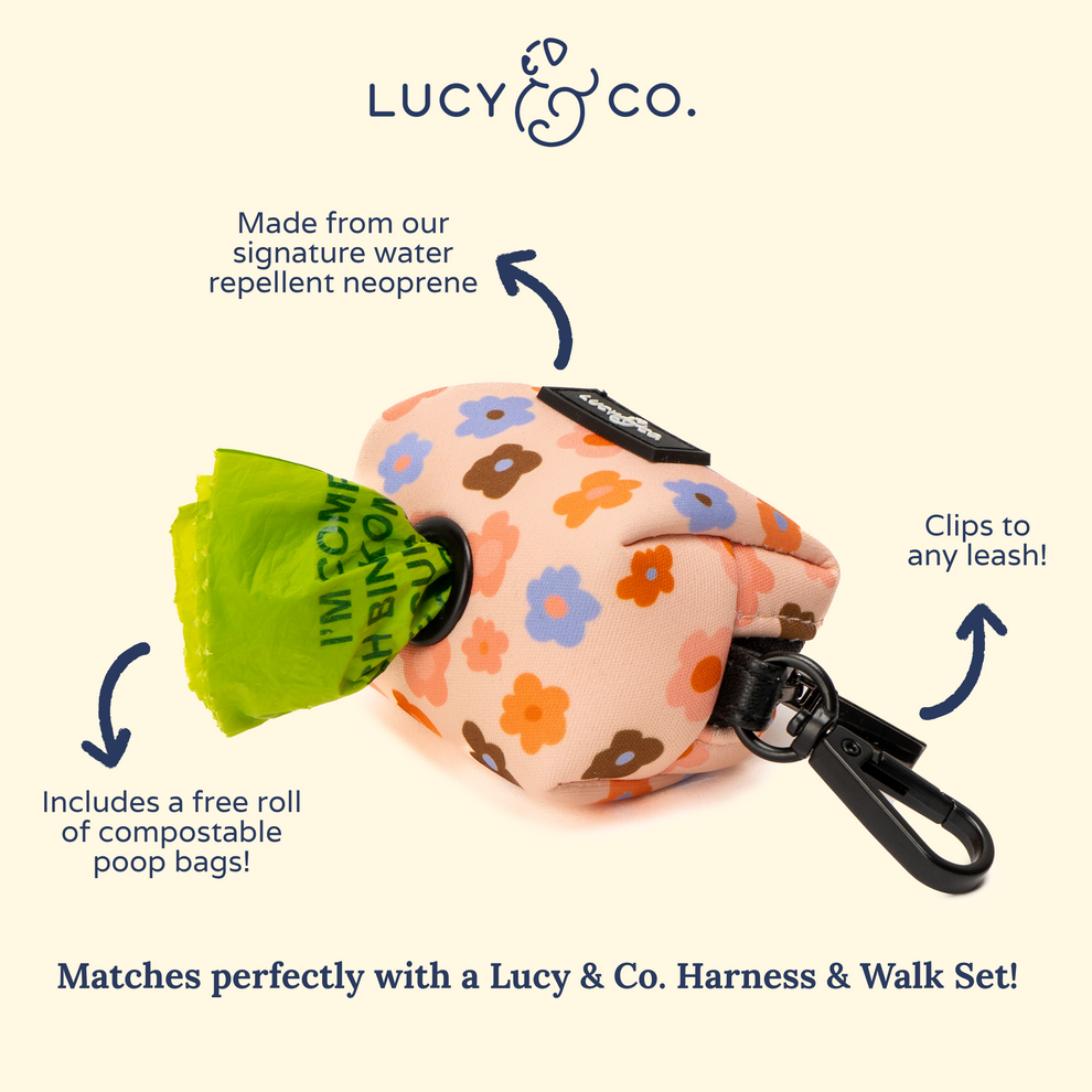 ¡Flores, color y buena vibra en cada paseo! El dispensador Let’s Groove combina estilo y practicidad con un diseño floral lleno de energía. Fabricado en neopreno repelente al agua, es perfecto para mantener tus bolsas a mano sin sacrificar estilo.